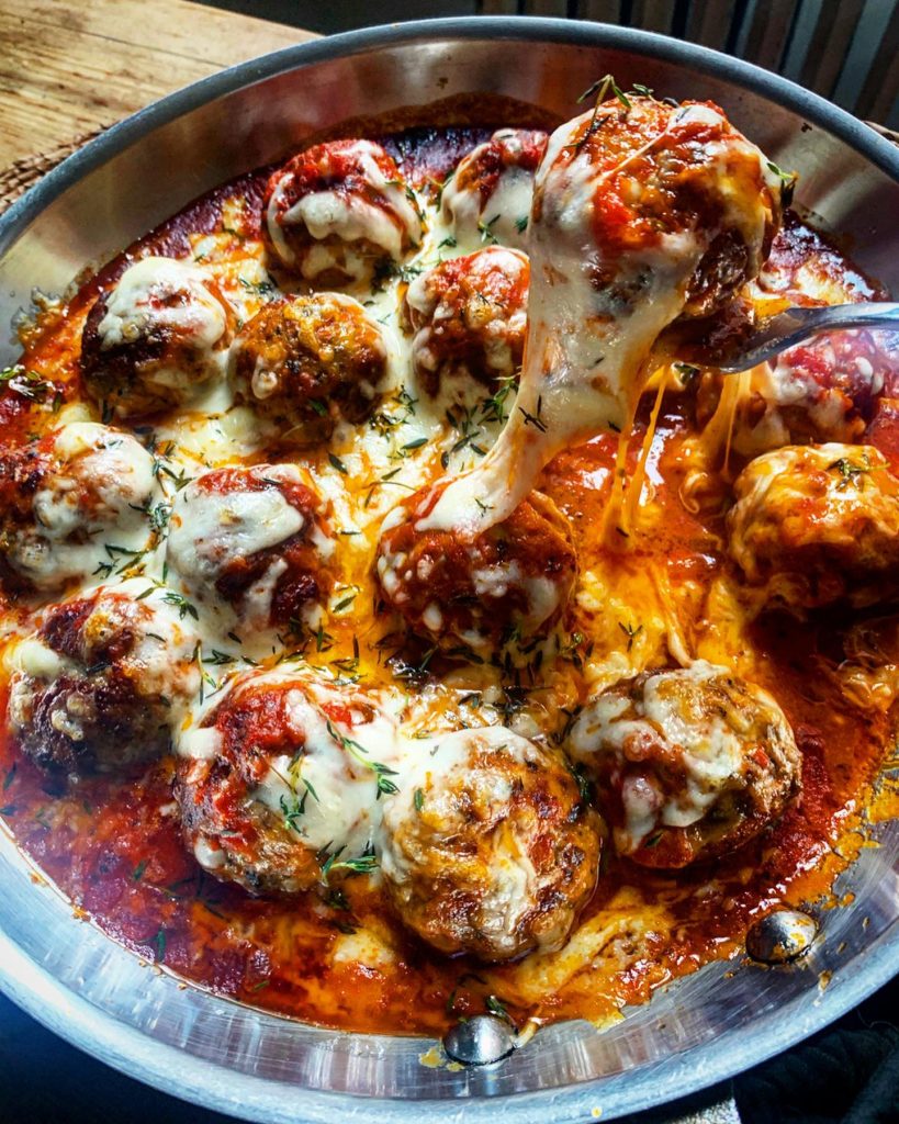- Remove skillet from heat, sprinkle shredded mozzarella on top of the meatballs evenly and put in 400F oven for about 12 minutes or until the cheesy top turn golden.