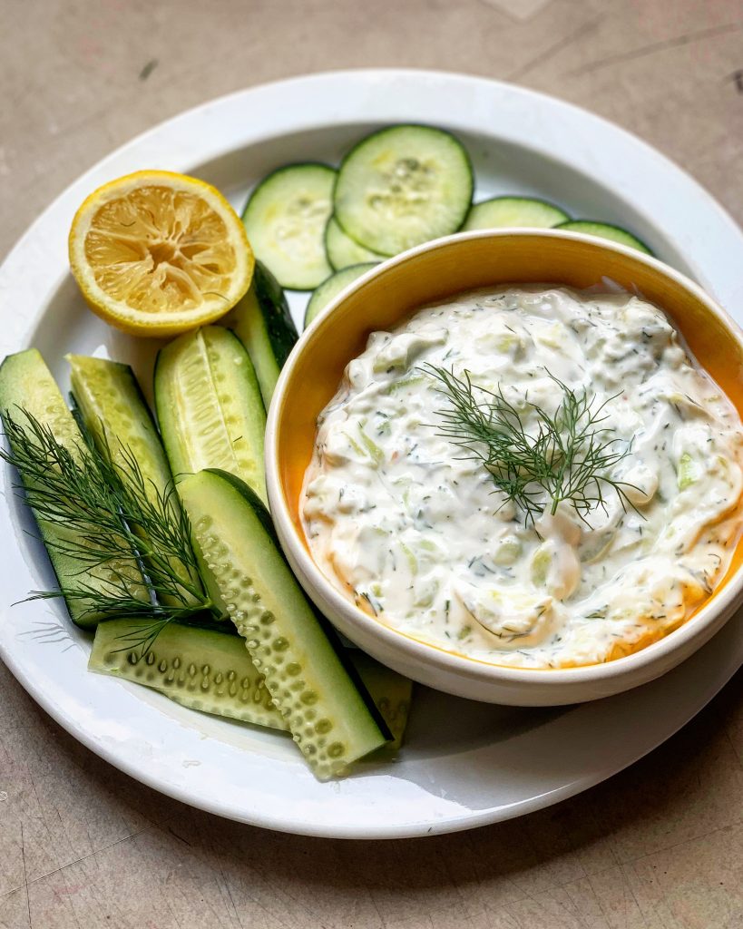 This is the easiest recipe ever! And the outcome is amazing. I wasn’t sure which one that could go with literally everything. Tzatziki or hummus. I think both, but now that we are in the heat of the summer, I feel like tzatziki is better.